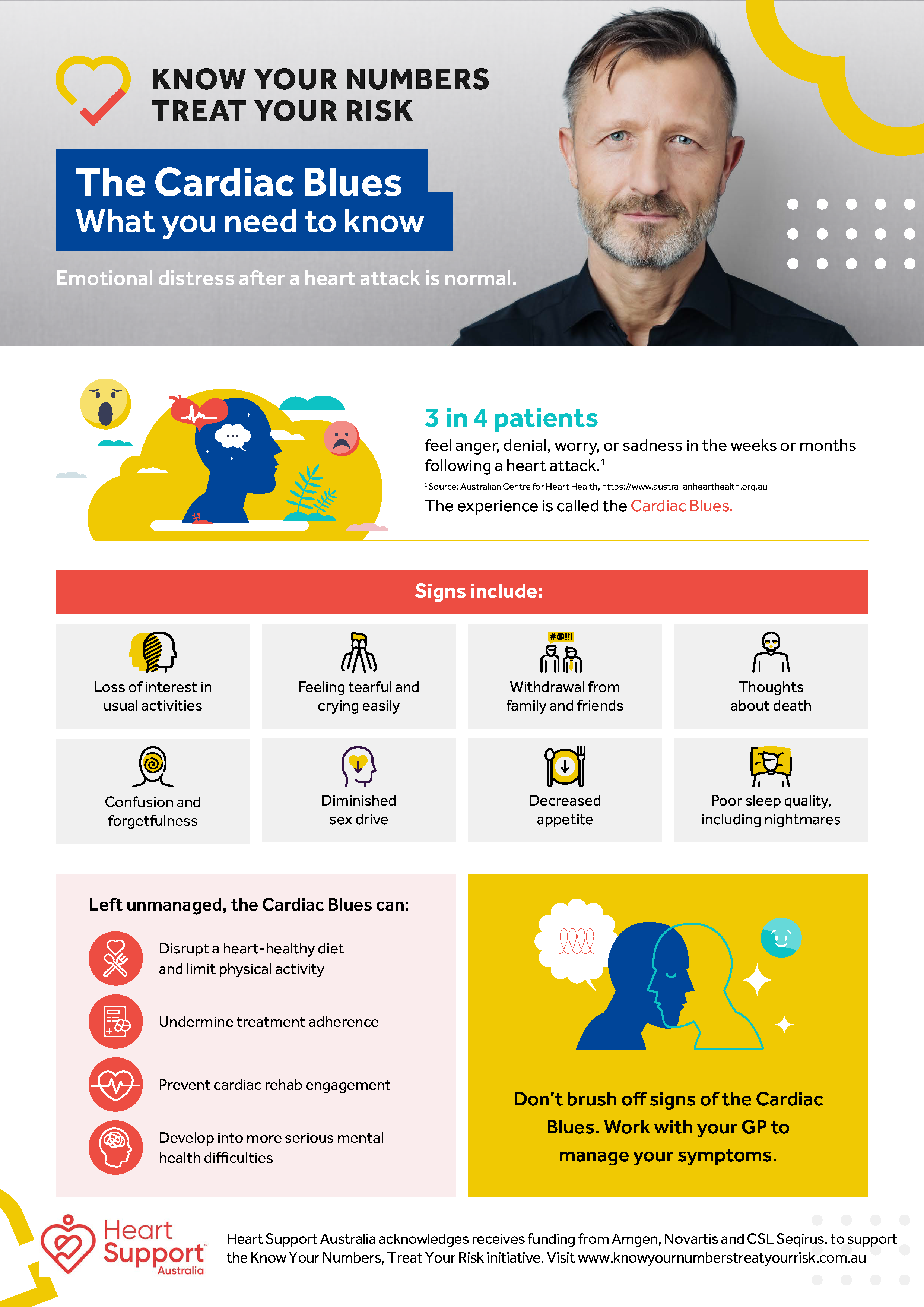 Having a heart attack can cause emotional and psychological symptoms such as shock, anger, mood swings, guilt, depression or anxiety. These feelings and thoughts are normal and known as Cardiac Blues.